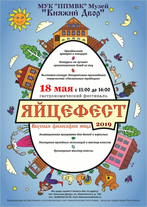 18 мая 2019 года с 11.00 до 16.00 на территории музея «Княжий Двор» Павлово-Посадского музейно-выставочного комплекса (городской округ Павловский Посад, поселок Большие Дворы, ул. Маяковского, д. 130) состоится гастрономический фестиваль «ЯйцеФест».